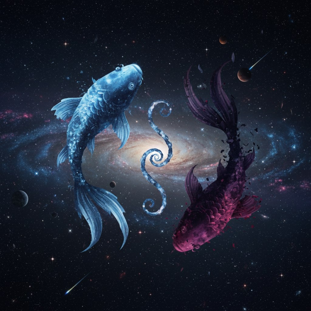 Две рыбы, плывущие в разные стороны — это про вечную внутреннюю раздвоенность. Одна хочет вверх, к мечтам, к иллюзиям, к духовному. Другая — вниз, в реальность, в материю, в быт. И они всегда связаны. Рыбы вечно мечутся между этими полюсами.
