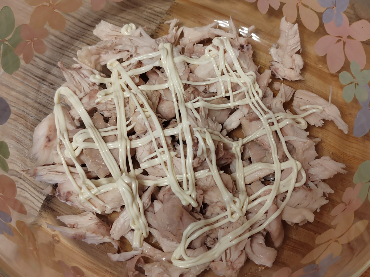 2. На дно салатник выкладываем куриное мясо. И сверху майонезную сеточку.