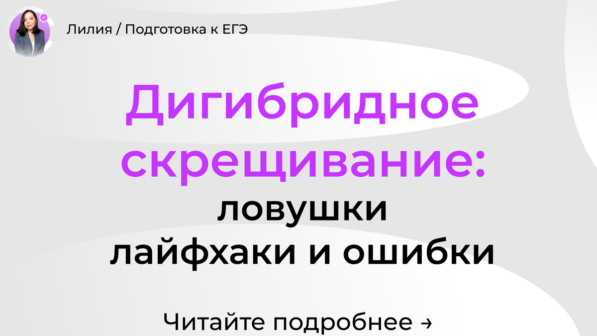 Каждый выпускник, сдающий биологию, сталкивается с задачами по генетике. И если моногибридное скрещивание (один признак) обычно не вызывает проблем, то дигибридное (два признака) часто становится камнем преткновения. В этой статье я, репетитор по биологии Лилия, подробно разберу, как правильно решать такие задачи, и дам лайфхаки, которые помогут сэкономить время на экзамене. Дигибридное скрещивание — это скрещивание организмов, различающихся по двум парам альтернативных признаков (например, цвет и форма семян). Впервые такие опыты провёл Грегор Мендель на горохе, и именно он вывел закон независимого наследования признаков. Если признаки наследуются независимо (находятся в разных хромосомах), можно не строить громоздкую решётку. Достаточно перемножить вероятности фенотипов по каждому признаку. Например, по цвету расщепление 3:1, по форме 3:1. Перемножаем (3:1) × (3:1) = 9:3:3:1. Этот метод особенно полезен, когда нужно быстро проверить ответ или решить задачу с несколькими признаками.