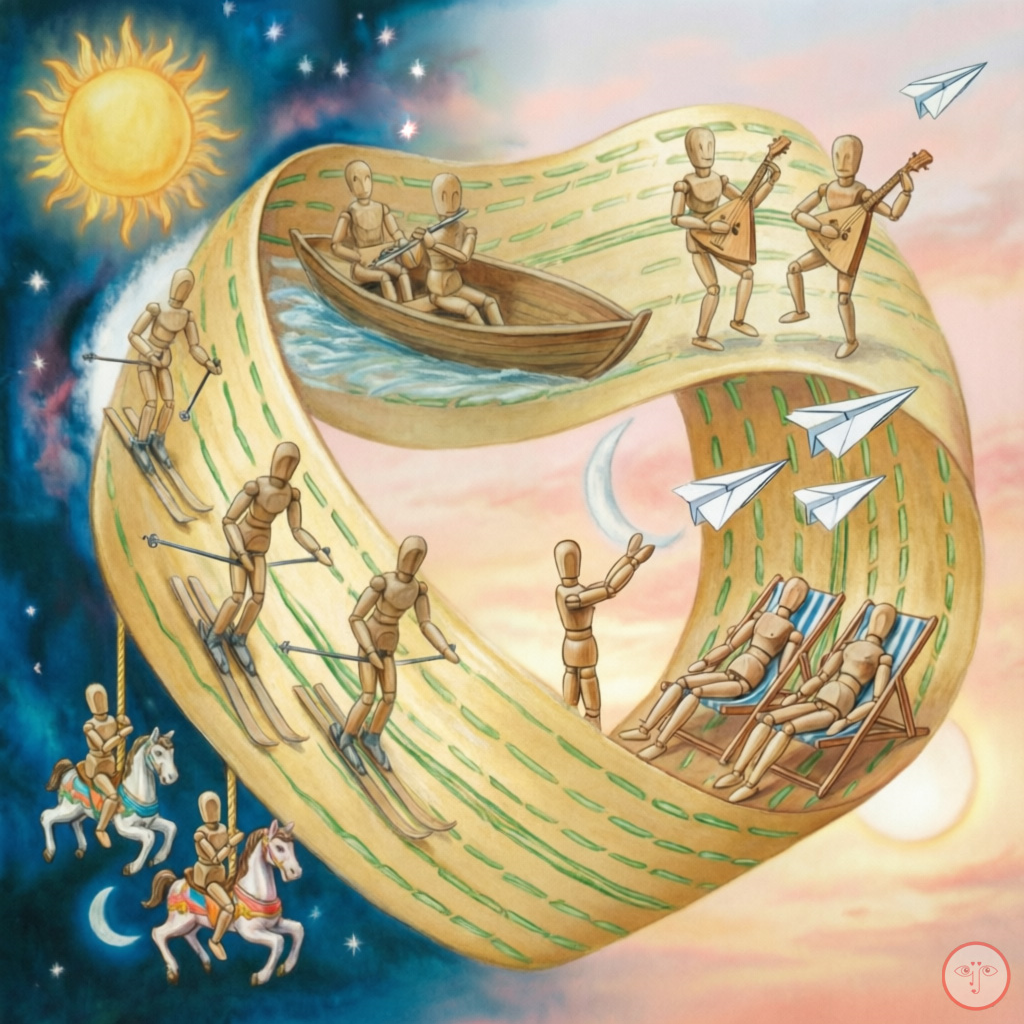 Время не течет линейно, оно сворачивается в кольца, как лента Мебиуса, повторяет себя на разных уровнях бытия. Поэтому, кто живет прошлым, не имеет будущего, а те кто живет только будущим, не живет в настоящем, то есть постоянно откладывает свою жизнь на потом.