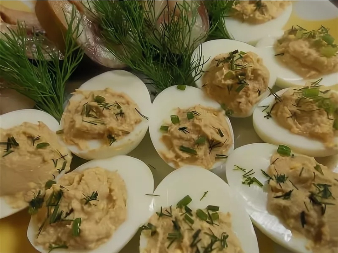 Яйца, фаршированные печенью трески «По-домашнему»