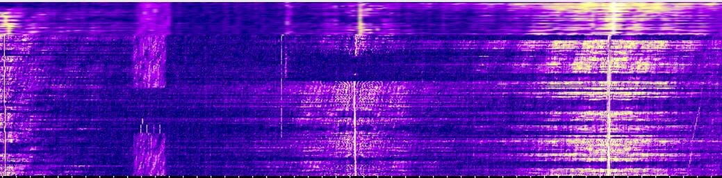 Эти боковые полосы прекрасно видны на водопаде (панораме) SDR-приемника. В центре — мощная несущая частота, а слева и справа от нее — "лепестки" с информацией, ширина которых равна полосе звукового сигнала.