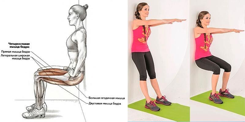 Это статическое упражнение, имитирующее сидение на невидимом стуле. Ты становишься спиной к стене, опускаешь корпус до угла примерно 90 градусов в коленях и удерживаешь положение некоторое время. Именно благодаря такому простому движению задействуются сразу несколько крупных мышечных групп: квадрицепсы, задняя поверхность бедра, икры и, конечно же, ягодичные мышцы.
