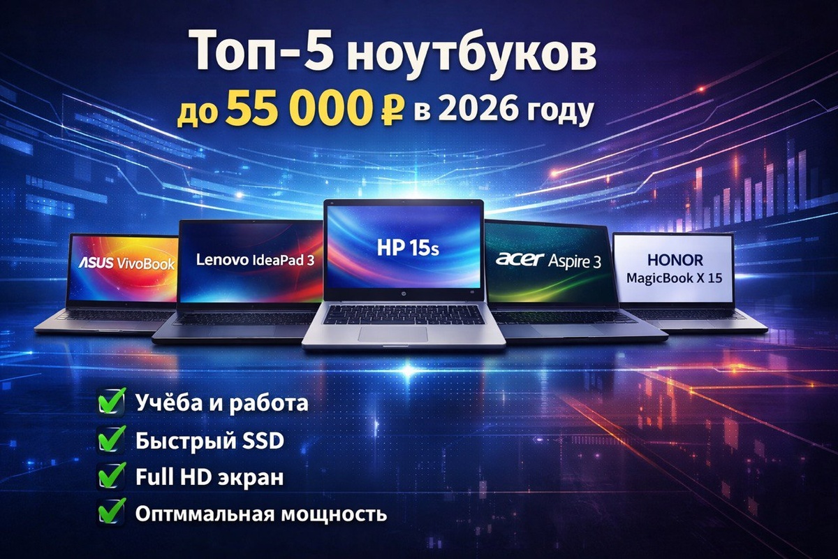 В 2026 году ноутбук в бюджете до 55 тысяч рублей — это уже не временный вариант, а полноценный инструмент для учёбы, работы и дома. Даже в этом сегменте можно рассчитывать на SSD, Full HD-экран и нормальную производительность для повседневных задач. Я собрал 5 ноутбуков, которые считаются самыми удачными в своём классе и действительно стоят внимания. ⸻ 🥇 ASUS VivoBook 15 Для чего подойдёт: учёба, офис, дом Основные характеристики: • Intel Core i3 (11–12 поколение) • 8 ГБ оперативной памяти • SSD 256 ГБ • Экран 15,6″ Full HD Почему в топе: Один из самых сбалансированных ноутбуков в своём бюджете. Быстро загружается, стабильно работает с браузером, документами и мультимедиа. Плюсы: хороший экран, качество сборки Минусы: не предназначен для игр ⸻ 🥈 Lenovo IdeaPad 3 Для чего подойдёт: работа, многозадачность, программирование Основные характеристики: • AMD Ryzen 5 5500U / 5600U • 8 ГБ ОЗУ • SSD 256 ГБ • Full HD дисплей Почему стоит выбрать: Один из самых производительных ноутбуков в с
