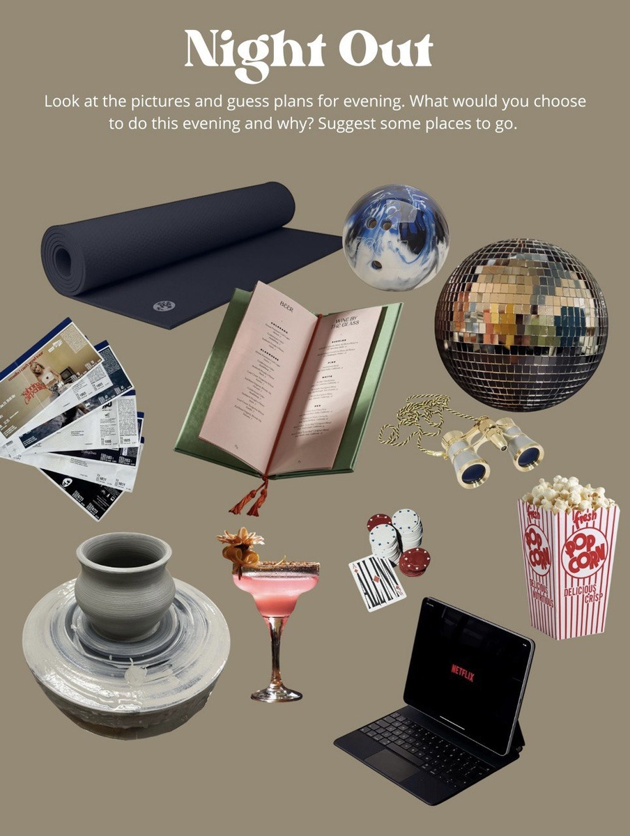 ✨ ⭐️Which of these activities do you like doing most on a Friday night? Which ones do you dislike? ⭐️Do you prefer going out with a large group of friends or just one best friend? Why? ⭐️If you had a free evening today, would you choose the "Netflix and popcorn" option or the "disco ball and cocktails" option? Explain your choice. ⭐️Some people prefer creative hobbies while others prefer sports. Which is better for relaxing after a stressful day? ⭐️What was the last live performance you saw? Was it worth the price? ⭐️Imagine you are planning a night out for a friend's birthday. Which three items from the picture would you include in the celebration? ⭐️Which activities in the picture are the most expensive? Which ones are the cheapest or free? ⭐️Many people now prefer watching Netflix at home instead of going to the cinema or a club. What are the advantages and disadvantages of staying at home?