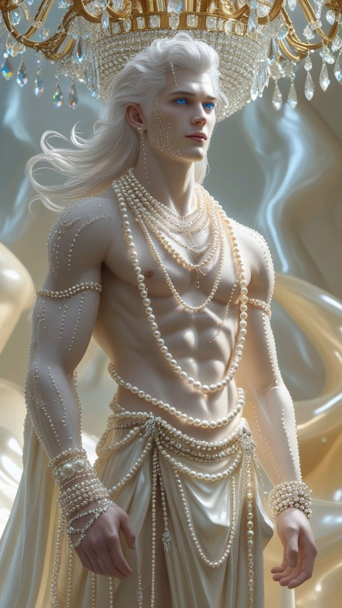 В лесах Сильварии его называли «Серебряным эхом». Эльф, чья кожа казалась сотканной из лунного света, а волосы — из тончайших нитей тумана. Но те, кто осмеливался подойти ближе, замечали странную деталь: Элдир никогда не расставался с жемчугом. Тяжелые нити обвивали его шею, плечи и запястья, словно кандалы, инкрустированные драгоценностями. Мир видел в этом эстетику. Но для Элдира это была хроника его поражений. Его секрет был в том, что он был «Ловцом угасающих мгновений». Эльфы живут вечно, но их чувства — нет. Природа наделила Элдира редким даром (или проклятием): он чувствовал момент, когда любовь женщины к нему достигала своего пика и начинала неизбежно клониться к закату. В тот самый миг, когда в сердце возлюбленной зарождалось первое сомнение или усталость от его вечного совершенства, ее самое яркое воспоминание о нем превращалось в жемчужину на его теле. Он буквально обрастал их памятью. Каждая бусина на его груди — это чей-то первый поцелуй, чей-то последний вздох или невыска