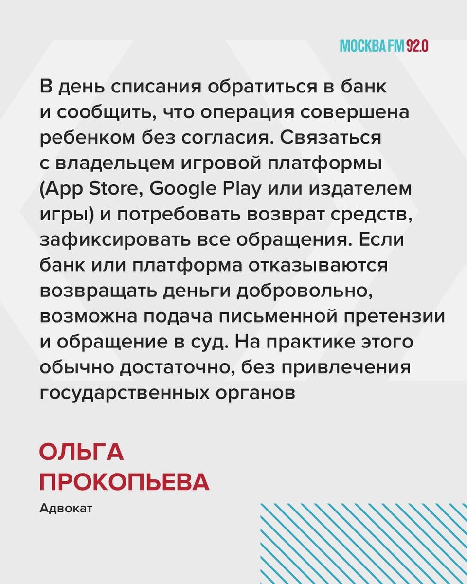 Но нужно действовать быстро, уверены юристы. По закону сделки, совершаемые несовершеннолетними, должны происходить с согласия родителей или законных представителей. Если ребёнок оплатил покупку без такого согласия, сделка может быть оспорена, — рассказала адвокат Ольга Прокопьева. При своевременных действиях вероятность вернуть деньги остается достаточно высокой, считает специалист. В возврате могут отказать, если: 🔼 карта или платежные данные находились в свободном доступе; 🔼 на устройстве не были установлены ограничения на покупки; 🔼 подобные операции ранее совершались и не оспаривались. В таких случаях может быть сделан вывод о ненадлежащем обеспечении безопасности карты со стороны родителей. 📌 Подписаться на Москва FM / Наш чат-бот / Мы в MAX