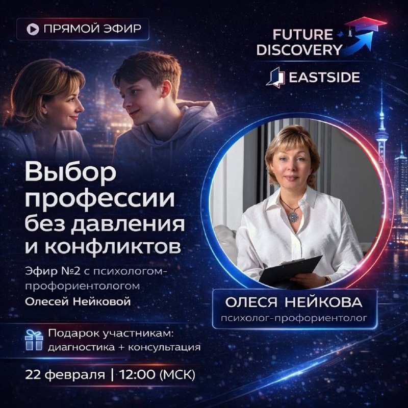 ❗️ • Самый частый страх родителей: «А вдруг мы направим не туда?» • Самый частый страх подростка: «А вдруг я выберу и пожалею?» Правда в том, что сегодня профессию нельзя выбрать “на глаз”. Нужна стратегия. Диалог. Понимание рынка. 📍 22.02 в 12:00 — эфир с психологом-профориентологом, рекрутером и вице-президентом Ассоциации профориентологов Олесей Нейковой. Разберём: — как помочь ребёнку определиться без давления — какие родительские стратегии реально работают — как среда и профориентационные поездки Future DISCOVERY влияют на выбор — что даёт весенняя экспедиция в Шанхай — и какие есть возможности грантов 🎁 Всем участникам — диагностика и консультация по краткосрочным программам в подарок! 👉🏻 Если хотите не просто «надеяться», что всё сложится, а выстроить понятный план — присоединяйтесь. 22 февраля | 12:00 (МСК) Этот эфир может стать точкой опоры в выборе будущего 🌎 🔗 Регистрируйтесь