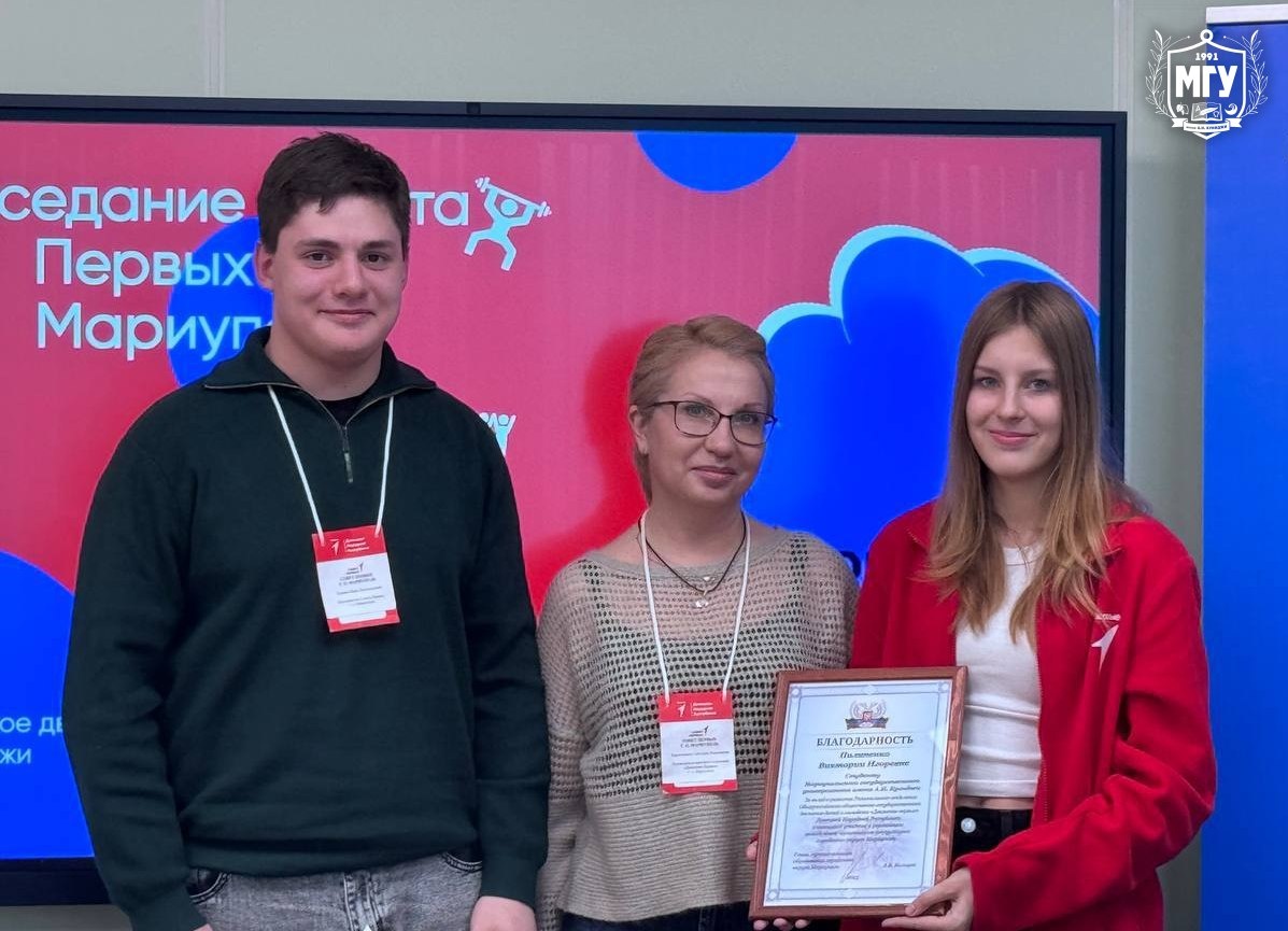 И. Куинджи отмечена благодарностью Главы Мариуполя 👍 Глава муниципального образования городского округа Мариуполь Антон Викторович Кольцов вручил благодарность Виктории Пилипенко — председателю ячейки «Движения Первых» МГУ имени А.И. Куинджи. ✅ Награда вручена за вклад в развитие Регионального отделения Общероссийского общественно-государственного движения детей и молодежи «Движение Первых» Донецкой Народной Республики и активное участие в реализации молодежной политики на территории городского округа Мариуполь. ⚡️ Поздравляем Викторию с заслуженным признанием и желаем дальнейших успехов, новых инициатив и ярких проектов во благо города и университета! 👻 MAX|💙ВК|📝Дзен|🤩Сайт #МГУимениКуинджи