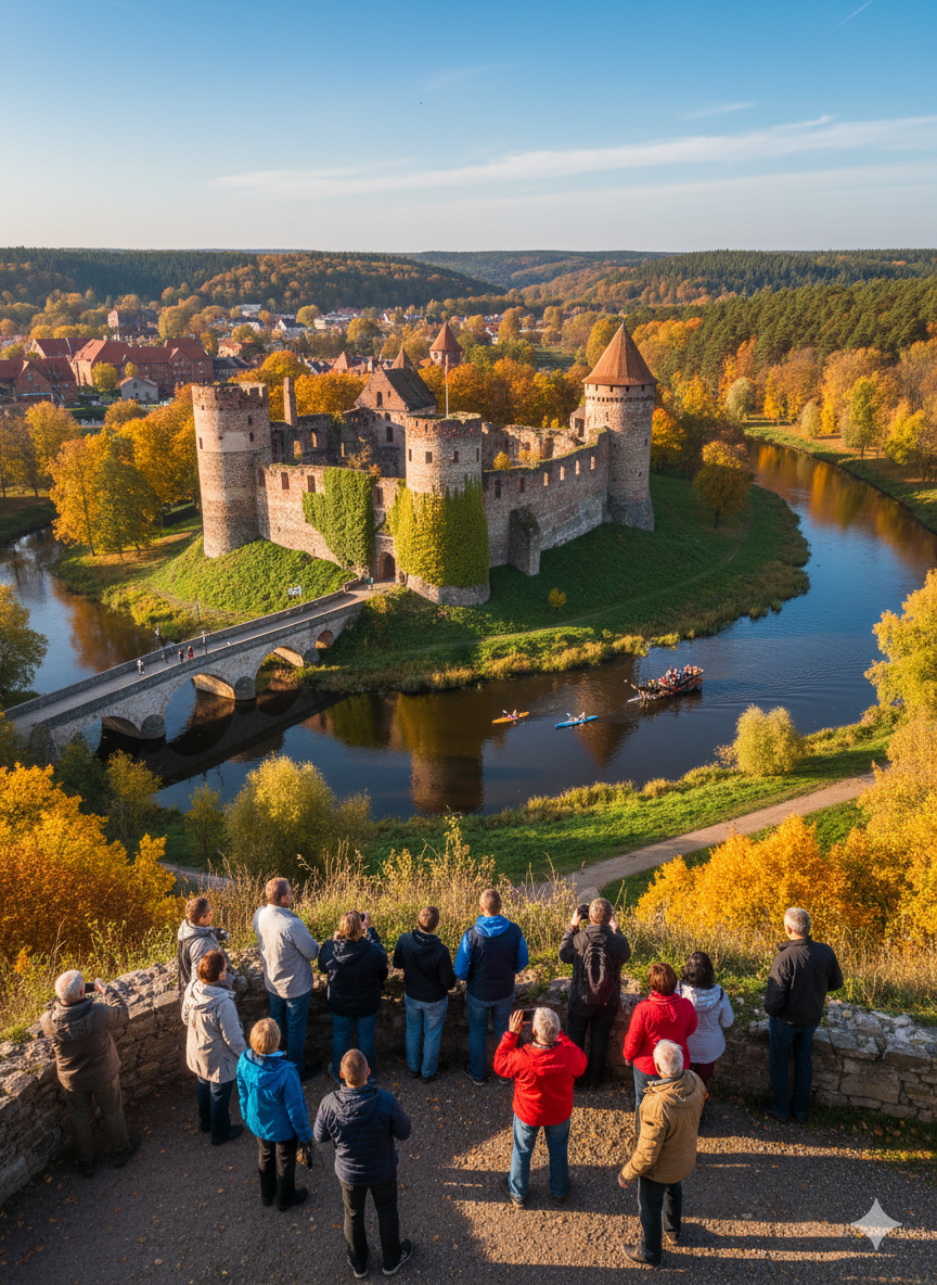 Сегодня можно обойти внутренний двор с массивными средневековыми стенами, заглянуть в башню и почувствовать, как несколько эпох наслаиваются друг на друга. С холма открывается красивый вид на речную долину. Рядом с замком находится действующий конный завод — посетить обе достопримечательности удобно за одну поездку.