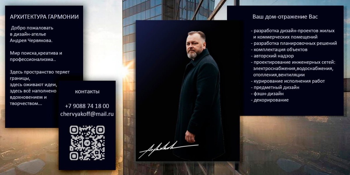 Занимаюсь своим сайтом.В нескольких программах делалась эта обложка.Выношу на суд.Готов выслушать критику и предложения по делу. Надеюсь на поддержку и Ваши комментарии. С уважением,А.Червяков,дизайнер интерьера.