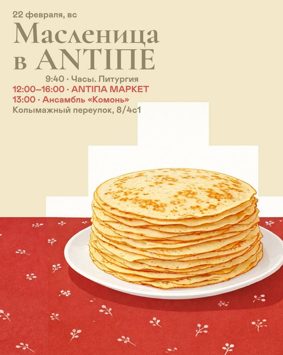 В Прощеное воскресенье приглашаем провести время вместе во дворе храма священномученика Антипы https://t.me/hramantipa/8083 сразу после Божественной литургии. Создатели локальных брендов и авторы творческих мастерских станут участниками нашего маркета. В этот раз нас ждут украшения ручной работы и натуральная косметика, предметы декора и одежды, художественные и керамические изделия. А еще живая музыка в исполнении ансамбля «Комонь»: яркое многоголосие, фольклорные мотивы и бодрое настроение масленичных гуляний. Традиционный корнер с согревающими напитками и ароматными блинами от кафе-трапезной. 🟡9:40 • Часы. Литургия 🟡12:00 — 16:00 • ANTIПА.МАРКЕТ 🟡13:00 • Ансамбль «Комонь» 📍Колымажный переулок, 8/4с1