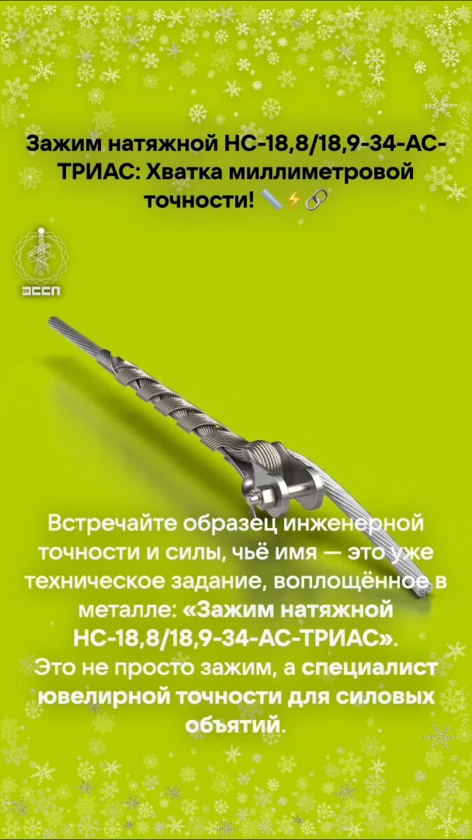 ⚡️ Зажим натяжной НС-18,8/18,9-34-АС-ТРИАС: Хватка миллиметровой точности! Встречайте образец инженерной точности и силы, чьё имя — это уже техническое задание, воплощённое в металле. Это не просто зажим, а специалист ювелирной точности для надежных силовых объятий. Давайте разберём его имя, где каждый символ имеет вес: 🔹 «НС» — Натяжной Спиральный. Классика жанра. 🔹 «18,8/18,9» — Диапазон диаметра провода в мм. Не «примерно 19», а строго в этих рамках! Это уровень часового мастера. ⏱️ 🔹 «34» — Технологический код: конструкция с несколькими прядями из немагнитной коррозионностойкой стали. 🔹 «АС» — Марка «подопечного»: сталеалюминиевый провод. 🔹 «ТРИАС» — Знак качества от АО «Электросетьстройпроект». 🔗 *В комплекте:* верный соратник — коуш К 120 (стальное «ушко», через которое передаётся вся мощь натяжения). 🏔 Его главная миссия: Держать намертво провод на анкерных опорах. Будь то обычный участок или сложнейший большой переход через реку или ущелье, где нагрузки достигают от 7
