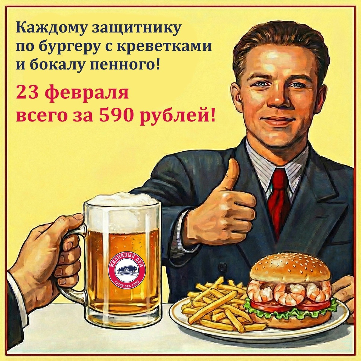 💪🏻🔥 Всего за 590 рублей: 🍔 Сочный бургер с креветками 🍟 Хрустящий картофель фри 🧂 Фирменный соус 🍺 Бокал разливного напитка на выбор Подкрепись сам и зови с собой друзей! 23 февраля в «Мидийном доме» на пр. Строителей, д.5 — специальное предложение для всех мужчин 💥 Резерв столов по телефону: 📞 +7 (921) 383-63-00