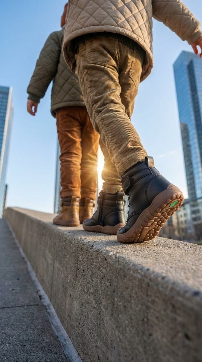 В большинстве стандартных ботинок носочная часть сужается. У детей же стопа по форме больше похожа на веер. Когда пальцы сжаты, ребёнок теряет устойчивость. Чтобы стопа была крепкой, пальцы должны свободно расправляться при каждом шаге — так вес тела распределяется правильно.