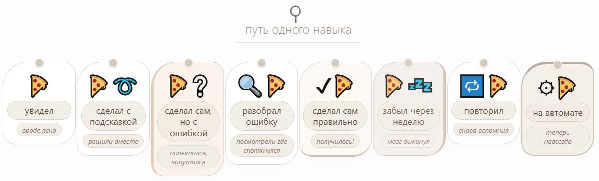 Потому что понимание — это не щелчок выключателя. Это не момент «А, понял!», после которого всё встаёт на свои места навсегда. Понимание — это лестница: Ребёнок может застрять между этапами 2 и 5 и прыгать туда-сюда неделями. Это нормально. Это и есть процесс учёбы. В школе нас приучили к иллюзии: если сегодня ученик понял тему, завтра он должен решать задачи как семечки. Но мозг так не работает. Особенно с такими абстрактными вещами,