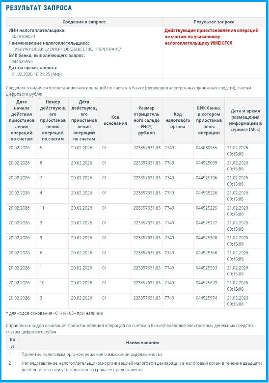 Подписчик поделился в ТГ-канале, что ФНС заблокировала счета Евротранса!!! Я проверила эту информацию на сайте ФНС и там действительно висит информация о блокировке счетов... Кроме этого в пятницу 20 февраля 2026 года ФНС заблокировала счета Антерре, Сибстеклу, а может кому-то еще. И если кто не в курсе, поясню, Антерра - это компания с кредитным рейтингом В-, которая тоже размещается облигации на Московской биржи, как и Евротранс. И СибСтекло размещает облигации, но их кредитный рейтинг ВВ-. То есть во вторник, когда откроются торги, рынок облигаций ждет красный день календаря.- Попробовала понять что происходит - не ясно. Висит только недоимка по налогам - 223,357 миллиона рублей. И тут я вспоминаю, что на прошлой неделе ФинУслуги объявили, что у них на платформе пройдет размещение облигаций Евротранса, а потом размещение отменили. И это конечно удивительно звучит: Хотели вас быстрее порадовать, но иногда в спешке можно ошибиться. Мне как блогеру - можно ошибиться, хотя конечно н
