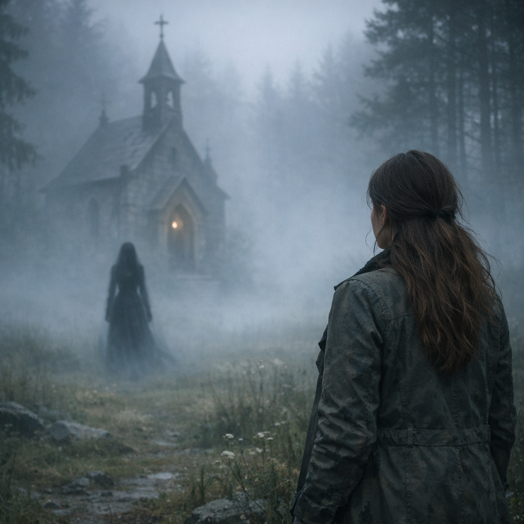 Мне было десять, когда я ослушалась. Любопытство жгло пятки. Я убежала в лес, продираясь сквозь колючие ветки, пока не выскочила на странную круглую поляну. Там стояла часовня. Старая, почерневшая от времени, с покосившимся крестом. А рядом, у входа, стояла женщина. В длинном чёрном одеянии, с закрытым лицом. Она просто смотрела на меня. Молча.