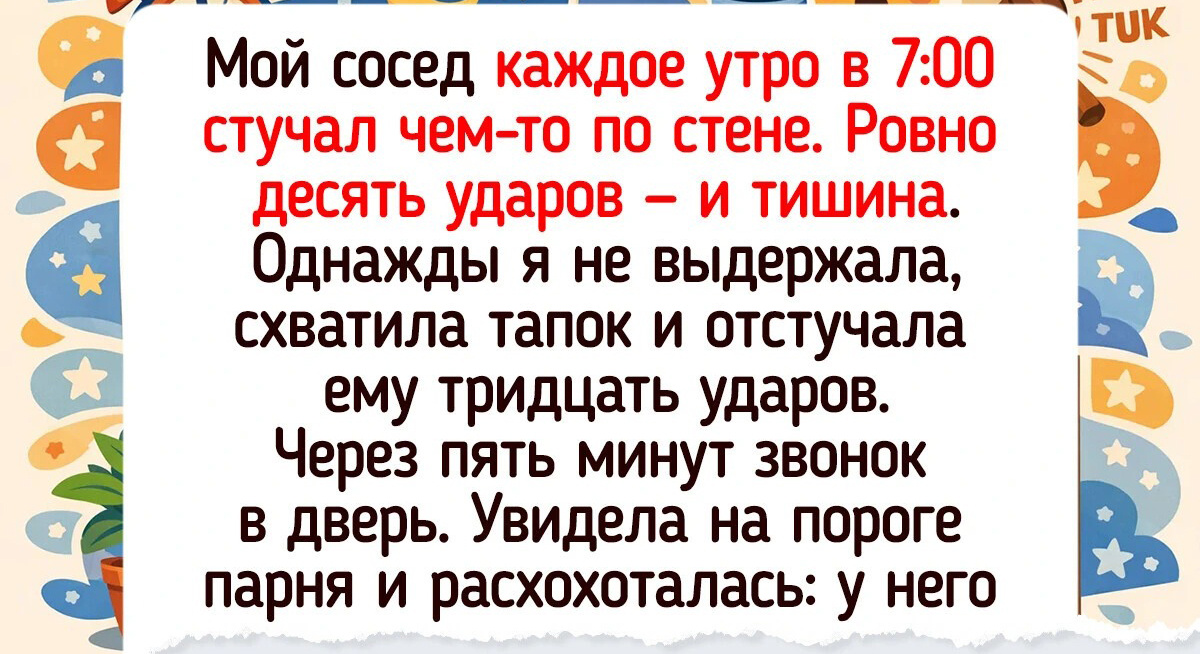 Случайности любят притворяться мелочами. Казалось бы, ничего особенного: ошибся одной цифрой в номере, застрял в лифте с комодом или просто попал к другому парикмахеру. Но порой такие моменты приводят к неожиданным встречам, крепким бракам и новой карьере. Мы собрали истории о том, как стечение обстоятельств или нелепый промах перевернули все с ног на голову. Мой сосед каждое утро в 7:00 стучал чем-то по стене. Ровно десять ударов — и тишина. Однажды я не выдержала, схватила тапок и отстучала ему тридцать ударов. Через пять минут звонок в дверь. Увидела на пороге парня и расхохоталась: у него в руках были скрипка и метроном. Он пробормотал: «Простите, я думал, что живу один в этом крыле. Я тренирую чувство ритма. Вы так четко стучали в стену! Вы не из консерватории?» Я действительно занималась музыкой. В итоге сосед позвал меня в свой проект, и теперь мы вместе выступаем на большой сцене. Подумать только: если бы я в тот момент не сорвалась и машинально не отбила четкий ритм, то до си