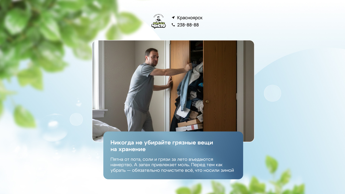Каждую весну одна и та же история: достаёшь любимое пальто из шкафа — а там пятно, которое вроде было маленьким. Или запах. Или моль поработала. Всё это можно предотвратить, если убрать вещи правильно один раз. Моль не ест чистое — это факт, подтверждённый энтомологами. Личинки моли питаются органикой: следами пота, жира, пищи на ткани. Чистая вещь для неё неинтересна. Именно поэтому дорогие шерстяные вещи страдают чаще — их реже стирают и чаще убирают «как есть». Кроме моли, въевшиеся за лето пятна от соли и пота окисляются и разрушают волокна — весной их уже не вывести. Пух — это не просто наполнитель, а структура, которая держит тепло за счёт воздушных карманов. Когда пух слипается, эти карманы исчезают и вещь перестаёт греть, поэтому обычная стирка — недопустима. Вакуумные пакеты помогут для коротких переездов, но не для хранения на несколько месяцев: сдавленный пух теряет способность восстанавливаться. Шерстяное волокно под воздействием воды и температуры необратимо садится — эт