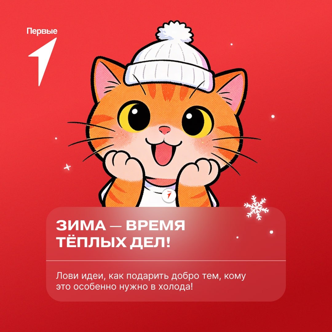 ! Февраль близится к концу, но всё ещё полон сюрпризов и возможностей для добрых дел вместе с Первыми. Проведи эти морозные деньки, даря тепло близким и незнакомцам. Ищи идеи в карточках ↗️ а ещё больше возможностей проявить себя ➡️ в канале Движение Первых. Добро!