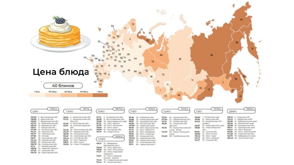Масленица — время, когда блины становятся не просто блюдом, а настоящим символом праздника. Эксперты Центра стратегических разработок составили карту цен на блюдо из 40 блинов по всем регионам России, и Астраханская область достойно представлена в этом «блинном рейтинге». Стоимость порции из 40 блинов в Астраханской области — 111,74 рубля, что попадает в категорию 110–120 рублей (отмечено светло-оранжевым цветом на карте). Регион входит в Южный федеральный округ (ЮФО) со средней ценой блюда 108,75 рублей. Цена в Астраханской области чуть выше среднего по ЮФО, но остаётся доступной. Это подтверждает умеренные цены на ингредиенты, баланс между традициями и современными кулинарными трендами, а также доступность блюда для жителей региона. Сравнение с другими федеральными округами показывает: