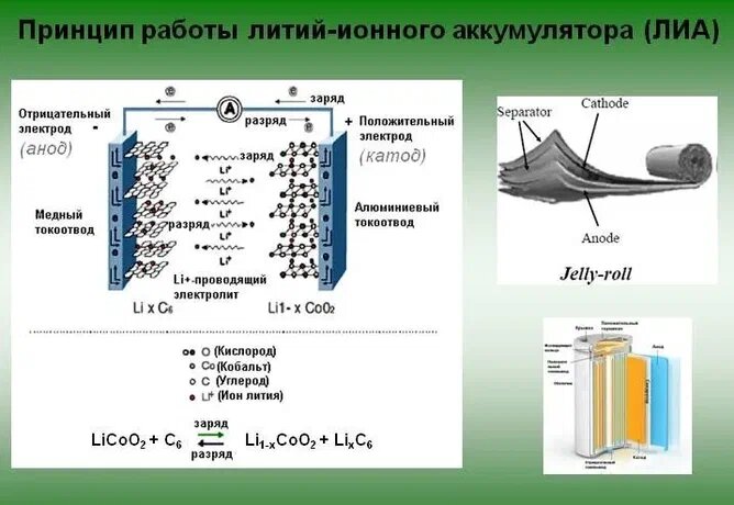 Как устроен и работает литий-ионный аккумулятор. Литий-ионный аккумулятор — это перезаряжаемый источник энергии, в котором переносчиком заряда служит положительно заряженный ион лития (Li+). Его работа основана на обратимых электрохимических реакциях между анодом и катодом через электролит. Основные компоненты: Катод. Состоит из оксида литиевого металла, например оксида кобальта лития (LiCoO₂), оксида марганца лития (LiMn₂O₄) или фосфата железа лития (LiFePO₄). Наносится на алюминиевую фольгу. Сепаратор. Пористая мембрана, которая физически разделяет анод и катод, предотвращая прямое электрическое соединение между ними. Позволяет ионам лития проходить через неё, удерживая электроды на расстоянии друг от друга. Обычно изготавливается из полиолефинового материала. Электролит. Проводящий раствор, содержащий соли лития (например, гексафторфосфат лития LiPF₆ в растворителе, таком как этиленкарбонат). Обеспечивает перемещение ионов лития между катодом и анодом. Коллекторы. Проводящие материа