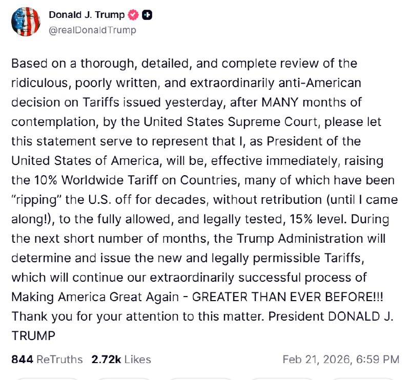, вынесенного вчера Верховным судом Соединенных Штатов после МНОГИХ месяцев раздумий, прошу считать это заявление официальным уведомлением о том, что я, как президент Соединенных Штатов Америки, с этого момента повышаю 10-процентный глобальный тариф для стран, многие из которых десятилетиями «обдирали» США безнаказанно (пока не пришел я!), до максимально допустимого и юридически обоснованного уровня в 15%. В течение следующих нескольких месяцев администрация Трампа определит и введет новые и юридически допустимые тарифы, которые продолжат наш чрезвычайно успешный процесс возвращения Америке былого величия — ВЕЛИЧИЯ, КОТОРОГО НЕ БЫЛО НИКОГДА ПРЕЖДЕ!!! Благодарю за внимание к данному вопросу. 👆Дональд (сапогом по трибуне) Трамп. 🟪Читай в Max | 🚀Читай в Telegram | 🥰Смотри на RUTUBE