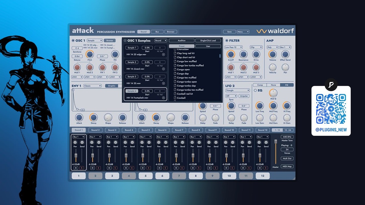 Waldorf - Attack 3 | барабанный синтезатор Подробнее: 🐾 Attack 3 — это мощный синтезатор в аналоговом стиле. Он воспроизводит 24 отдельных звука для каждой ударной установки, из которых 12 можно использовать полифонически. От мощных ударов до мелодичных перкуссионных партий — этот инструмент создан для создания ритмов, которые захватывают и сердца, и динамики. Attack 3 объединяет дух легендарных аналоговых драм-машин 1980-х и драйвовое звучание 1990-х, перенося их в современные продакшены. Он создан для формирования звучания ударных в следующем десятилетии. Каждый звук в Attack 3 как живой. Параметры можно настраивать в реальном времени и автоматизировать в DAW, что открывает простор для экспериментов. Несмотря на расширенные возможности сэмплирования, инструмент остается верен своей философии: чистый синтез для создания уникальных перкуссионных звуков с нуля. Новый дизайн делает создание ударных быстрым и удобным. Масштабируемый интерфейс и улучшенный механизм синтеза делают Att