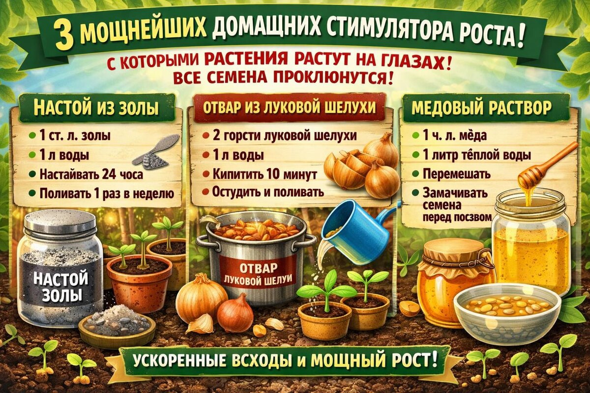 (Забудьте про дорогие Эпины и Цирконы. На вашей кухне живут 3 монстра, которые разбудят любые семена, заставят корни расти с бешеной скоростью и поднимут даже умирающую рассаду. БЕСПЛАТНО. ЭФФЕКТИВНО. ПРОВЕРЕНО.) ❌ ВАС РАЗВОДЯТ НА ДЕНЬГИ! Вам продают красивые ампулы с непонятными названиями, обещая "чудо-эффект". Чудес не бывает. Бывает БИОЛОГИЯ. Растениям нужны не магические заклинания, а конкретные вещества: ауксины (для корней), гиббереллины (для роста), витамины (для иммунитета). И всё это уже есть у вас дома. Главный секрет: Самый мощный стимулятор — это не одна таблетка, а комплекс из доступных компонентов, которые работают в синергии. Мы дадим 3 разных рецепта под разные задачи. СУТЬ: В коре ивы содержится салициловая кислота (природный антисептик) и ауксины (природные гормоны роста корней). Это бесплатный аналог "Корневина", только в 10 раз мягче и эффективнее. ЧТО НУЖНО: ПРИГОТОВЛЕНИЕ: ПРИМЕНЕНИЕ: СУТЬ: Мед — это не просто сахар. Это кладезь ферментов, аминокислот, витаминов