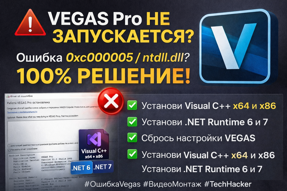 Если при запуске VEGAS Pro 20/21 у вас появляется ошибка вроде: — в большинстве случаев причина очень простая: не хватает системных библиотек Windows (Visual C++) или нет нужного .NET Runtime. У меня была именно ошибка 0xc0000005 / ntdll.dll, и после установки двух компонентов VEGAS запустился сразу. Ниже — пошагово. Скачайте и установите две версии (важно!): https://aka.ms/vs/17/release/vc_redist.x64.exe https://aka.ms/vs/17/release/vc_redist.x86.exe Иногда он стоит, но “криво” или повреждён. Тогда сделайте так: Vegas 20/21 использует .NET-модули. Если их нет — запуск часто падает. Ставим обе версии: https://dotnet.microsoft.com/en-us/download/dotnet/6.0 https://dotnet.microsoft.com/en-us/download/dotnet/7.0 На странице выбирайте Runtime (обычно Windows x64). После установки — перезагрузите компьютер. Иногда конфигурация повреждается (после плагинов/крэка/обновлений). Сброс делается так: Обычно конфликт 32/64-битных библиотек.