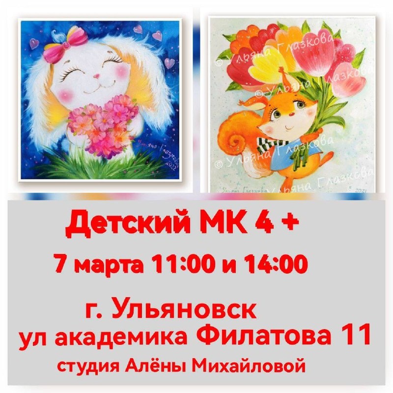 АНОНС на МАРТ ✅ МАСТЕР-КЛАСС от Ирины Рагузиной ЗАВОЛЖСКИЙ РАЙОН 7 марта в 11.00 и 14.00 ул. Академика Филатова 11 студия Алёны Михайловой Пишем Весеннее настроение Стоимость Детского МК 1300 рублей Стоимость МК для подростков и взрослых 1600 рублей все необходимые материалы включены в стоимлсть.