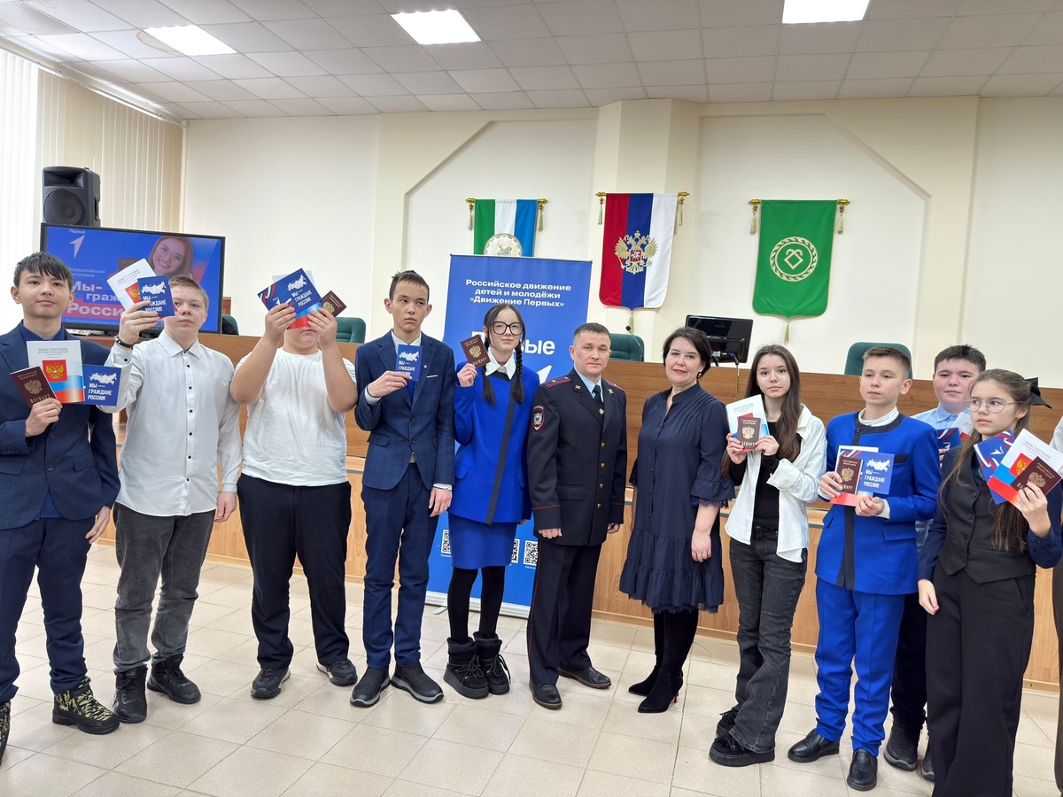 В зале заседаний администрации района состоялась торжественная церемония вручения паспортов. Главный документ, удостоверяющий личность и гражданство Российской Федерации, юным жителям района вручила Эльза Ахметгареева — заместитель главы администрации района по социальным вопросам и кадровой политике. С важным событием ребят также поздравил Наиль Мухаматгалиев, начальник миграционной службы отделения МВД России по Аскинскому району, майор полиции. Он рассказал о правилах регистрации по месту жительства, возможностях портала «Госуслуги», напомнил об ответственности граждан Российской Федерации перед законом и перечислил обязанности владельцев паспорта В этот торжественный день подростки получили не только свои первые паспорта, но и памятные подарки — обложки для документов и значки с логотипом «Движение первых». Разделить радость события и поддержать ребят пришли родители и одноклассники. Этот день навсегда останется в памяти подростков как начало нового, важного пути — пути гражданина