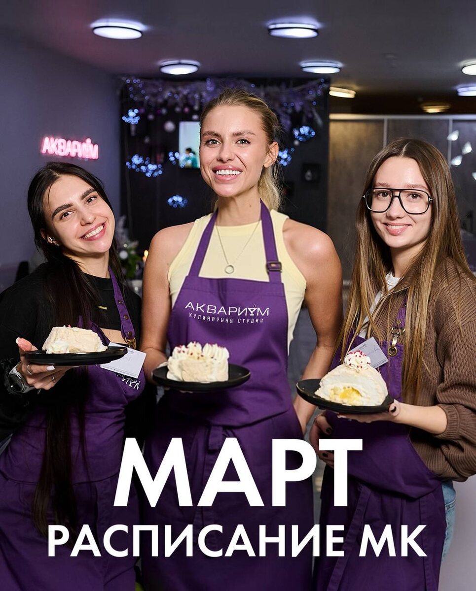 🌸☺️ Весна наступила... и у нас на кухне 💜 Март — месяц контрастов: за окном то снег, то солнце, а в @aquarium_studia всегда тепло, ароматно и вкусно. Мы собрали для вас самые сочные мастер-классы первого весеннего месяца. Вот лишь несколько поводов заглянуть к нам в марте: 🟣 8.03 (13:00) – ПРАЗДНИЧНЫЙ БРАНЧ Начало дня, о котором вы мечтали! • Драники из кабачка с форелью моментального посола, яйцом пашот и соусом Бер блан • Тартин с ростбифом, печеным перцем и соусом тоннато • Рисовая каша с манго, кокосовым кремом, миндалем и цветами весны 🍾Праздничное игристое и б/алк. напитки 🎁 Подарки для милых дам от партнеров студии 📸 Яркие кадры от фотографа Ведущий МК: Георгий Бухарцев, шеф-повар студии, участник ТВ-шоу «Молодые ножи» на «Пятнице» Стоимость участия: 4000р/чел. 🟣 8.03 (18:00) – УЖИН ДЛЯ МИЛЫХ ДАМ (и не только!) Вечер вкуса, впечатлений и весеннего настроения • Салат с тигровой креветкой, обожженной тыквой, грушей, кремом Дор блю и трюфельной заправкой • Веллингтон