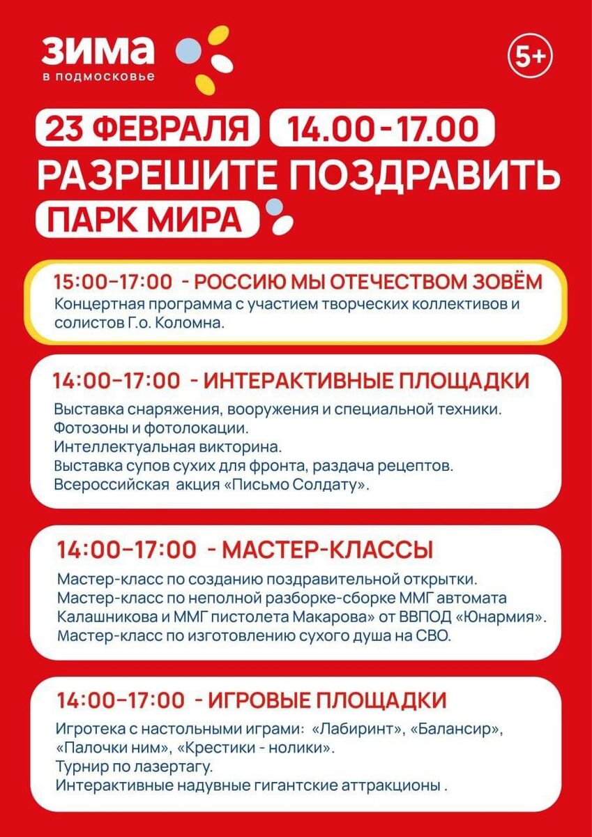 !» Дворец культуры «Коломна» приглашает жителей и гостей Городского округа Коломна на событийное мероприятие «Разрешите поздравить!», посвященное Дню Защитника Отечества 🇷🇺 Для детей и взрослых мы подготовили насыщенную и разнообразную программу: Концертная программа с участием лучших творческих коллективов и солистов города создаст праздничную атмосферу и подарит хорошее настроение. Интерактивная выставка снаряжения, вооружения и специальной техники, с участием служб сферы обеспечения национальной безопасности. Тематические фотозоны и фотолокации. Игротека с настольными играми, интерактивные надувные аттракционы и интеллектуальные викторины. Мастер-классы по созданию поздравительной открытки, по изготовлению сухого душа на СВО и по неполной разборке-сборке ММГ автомата Калашникова и ММГ пистолета Макарова» Дата: 23 февраля 14:00 - 17:00 Место: Парк Мира, г.Коломна Источник #23февраля #коломнаZдесь #паркМира