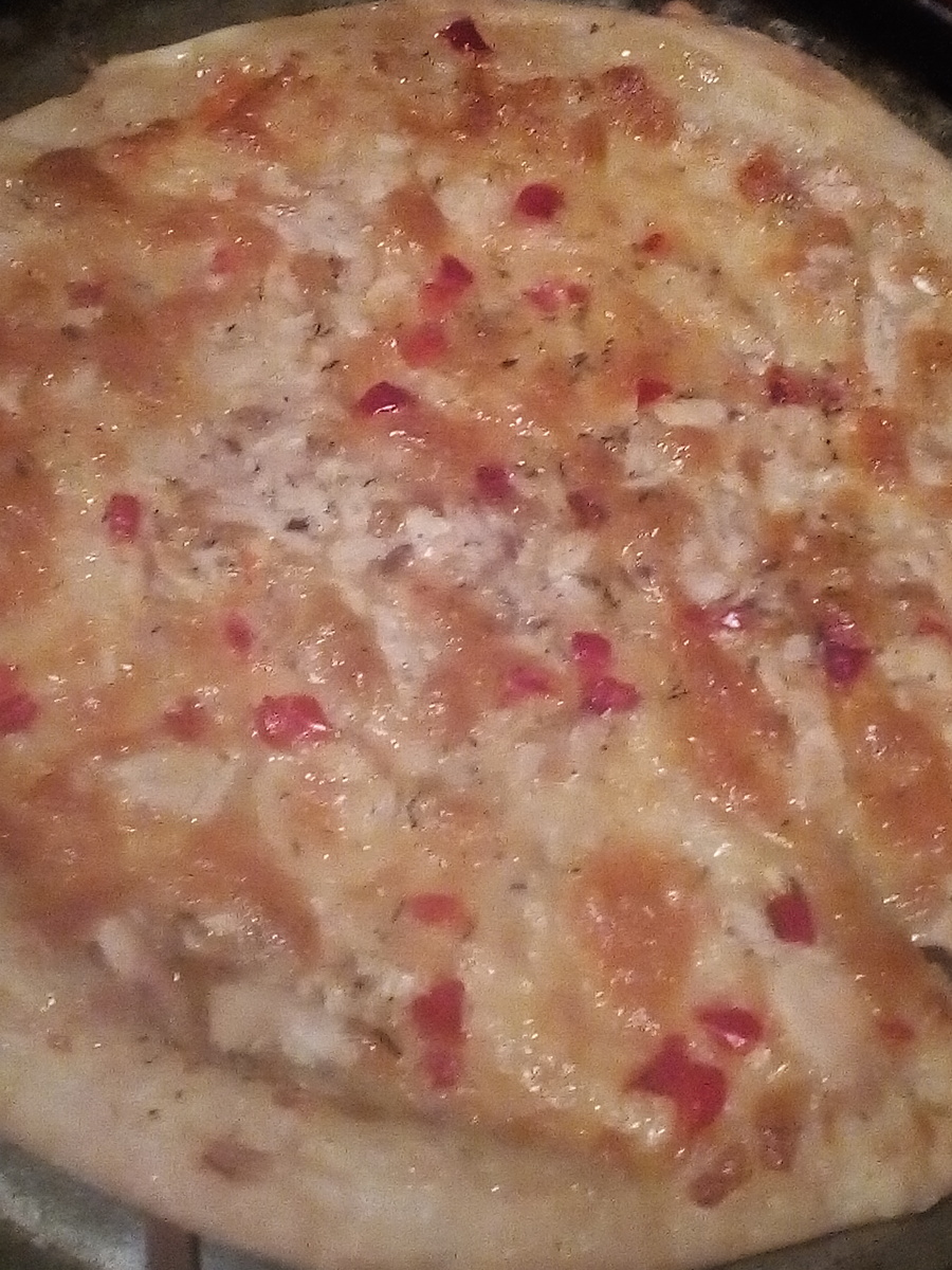 Иногда беру маленькую сковордку, отрываю кусок и разжариваю... А сегодня - целиком положил на сковородку и засунул в духовку на пол часа... Чего такая бледная? А она с филе цыпленка, а не колбаской... А раз бледная - я вместо в качестве соуса позже применил кетч... Хорошо пошла, под перебродивший квас... :0)))) Думаете после 30 минут - станет сухой? Местами - да. Но! У меня три дочки же - не первый год замужем.... У меня же , как говорил профессор Преображенский в "Собачьем сердце": - Опыт... :0))) Я краюшек диска промазал майонезом. Не у Пронькиных! А между пиццей и сковородкой - у меня не масло, а три китайских деревянных палочки... Японских? Ну, возможно... :0))