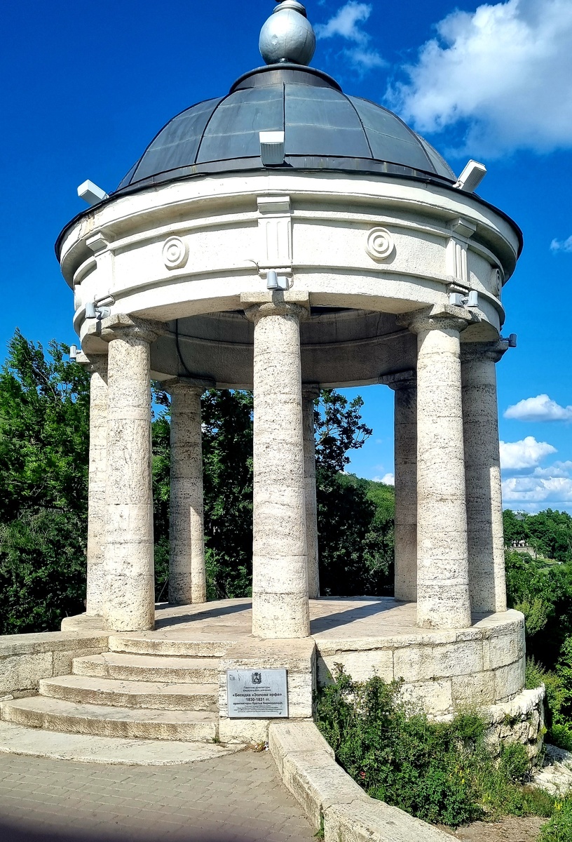 Беседка стояла грязная, запущенная, вся расписанная. Стены в граффити, вокруг бутылки, окурки, скамеек нет, мусорки нет, цивилизации нет. Красота архитектуры тонула в том, что остаётся после людей, которым плевать.