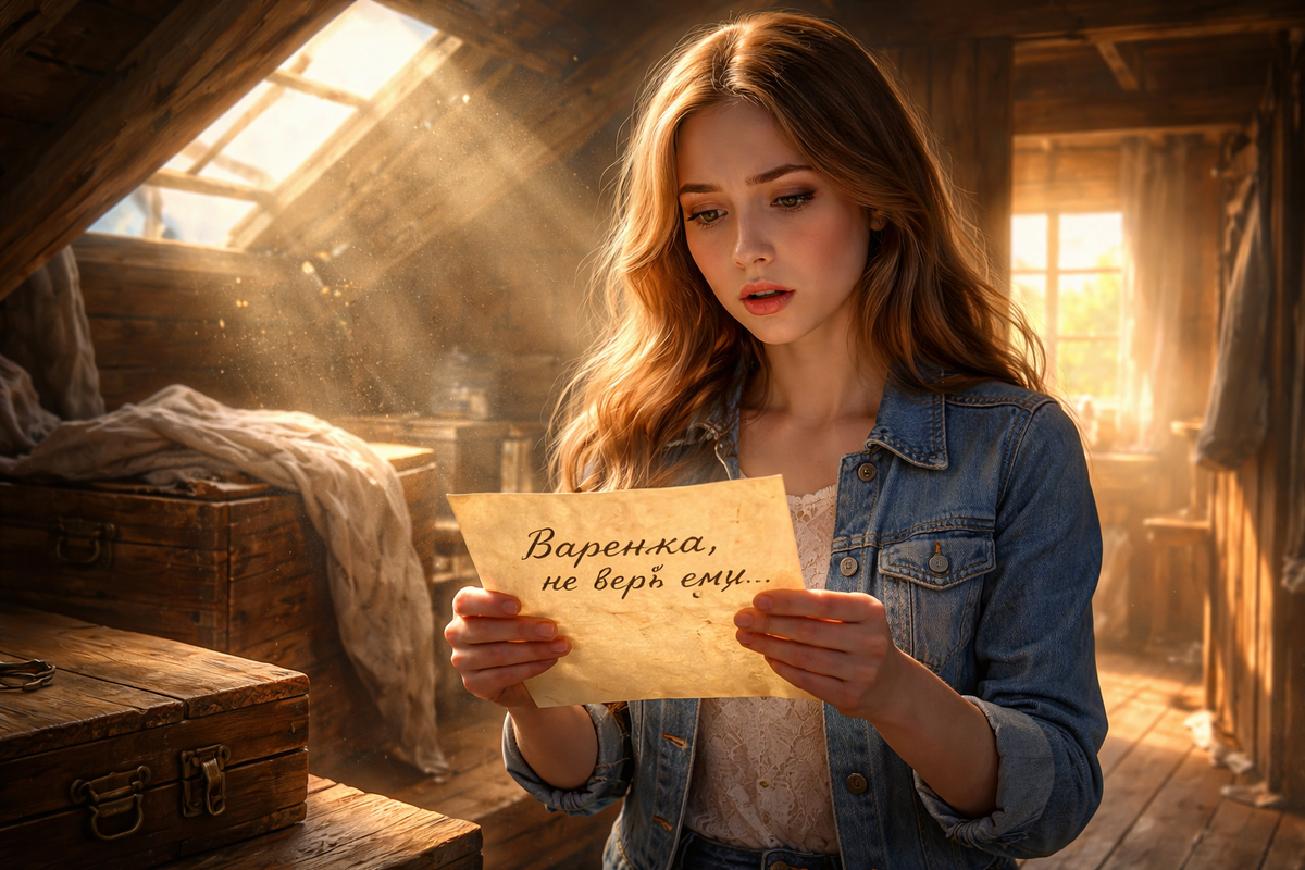 Поднявшись на чердак, Варя случайно заметила деревянную шкатулку, спрятанную под старым одеялом. Внутри лежала пожелтевшая записка.