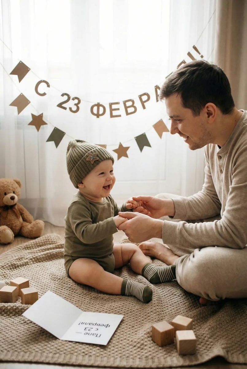 Самое лучшее поздравление :) **Важно:** сохранить черты лица с загруженных референс-фотографий — перенести реальную внешность людей максимально точно. --- Создай фотографию **Соотношение сторон:** 2:3 **Жанр и свет** Реалистичная фотография. Уютная квартира, мягкий дневной свет из окна. **Сцена** Ребёнок до года сидит на большом пледе на полу. Рядом — папа в домашней одежде: он держит сына-малыша за ручки и улыбается. Тёплая семейная атмосфера, искренние эмоции. **Образ ребёнка** Бодик цвета хаки/оливковый. Вязаная шапочка с небольшой звездой-аппликацией. Носочки в полоску. **Декор и реквизит** На фоне — простая праздничная гирлянда с надписью «С 23 февраля!» на русском языке, небольшие бумажные звёзды и флажки. Без оружия и военной символики. В кадре: открытка с надписью «Папе — с 23 февраля!», детские кубики, мягкая игрушка-медвежонок. **Техника съёмки** Камера: 50mm, f/2.0. Мягкое боке, натуральные тона кожи, лёгкое плёночное зерно, аккуратная виньетка. **Качество** Высокая