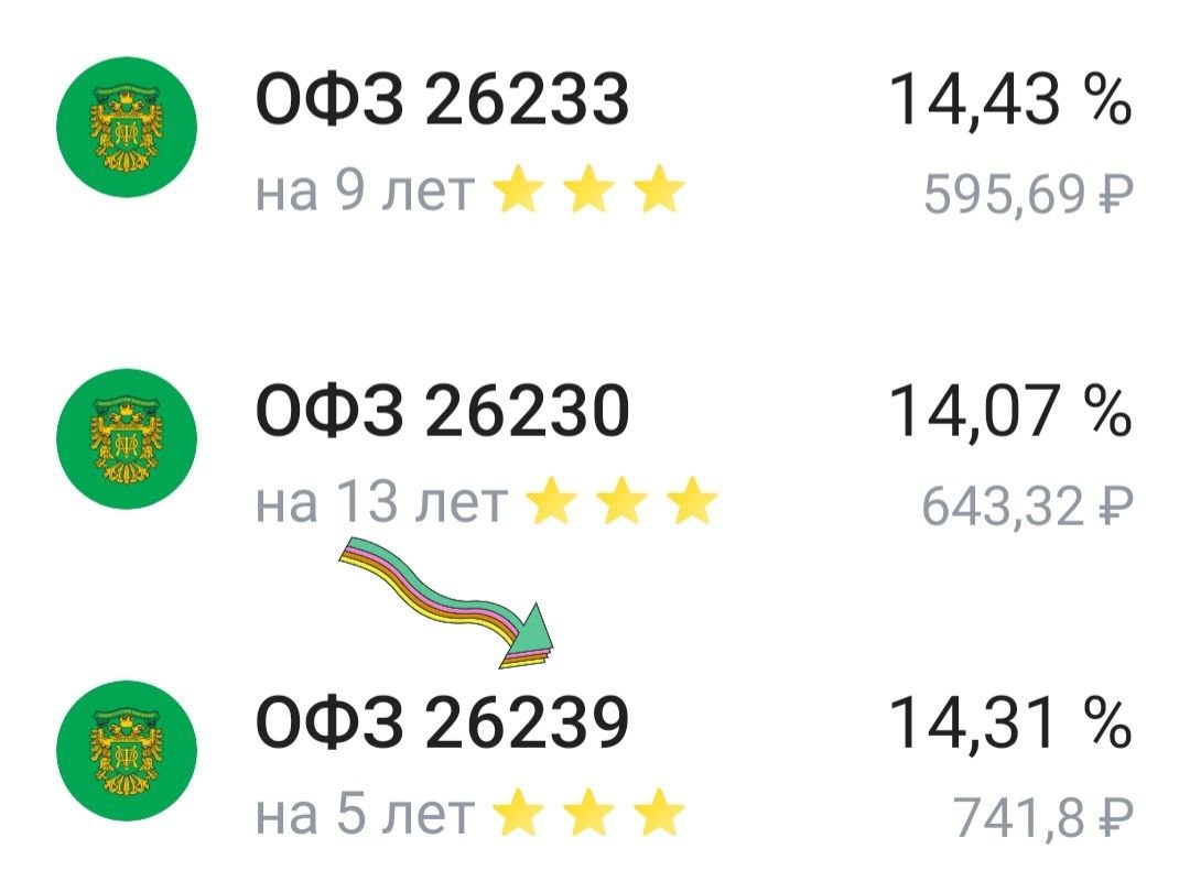 Давно присматривалась к двум ОФЗ. Обе с выплатами в январе и июле, у меня эти месяцы в календаре выплат самые слабые. Решила закрыть вопрос и прикупить на небольшую привалившую сумму. Выбирала между: 🏛ОФЗ 26233 Цена 595 ₽ (в моменте), доходность к погашению 14,43%, погашение через 9 лет. Купон 30,42 ₽ два раза в год. 🏛ОФЗ 26239 Цена 741 ₽, доходность 14,31%, погашение через 5 лет. Купон 34,41 ₽ два раза в год. Цифры примерно одинаковые, доходность почти равна. Но решила посчитать, что выгоднее. Прикинула на ту же сумму: 10 штук 26239 = 10 × 741 = 7 41 ₽ Если бы я купила на эти деньги 26233: 7 140 ÷ 595 = 12 штук (12,45) Сравнила купоны за год: Разница 42 ₽ в год в пользу 26233. Но! Я всё равно выбрала 26239. Почему: ➡️ Погашение через 5 лет, а не через 9. За 9 лет инфляция съест больше, чем эти 42 ₽. ➡️ Купон чуть выше — приятнее получать. ➡️ Через 5 лет деньги вернутся, и я решу заново, куда их вложить. А через 9 лет, кто знает, что вообще будет. В общем, взяла 10 штук ОФЗ 26239.