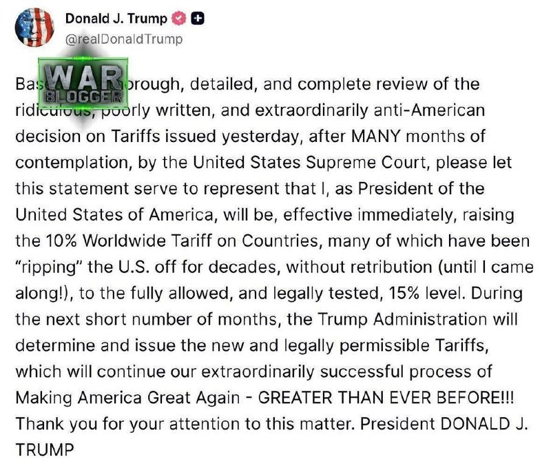 ‼️🇺🇸🏴☠Трамп рвёт и мечет: вводит 15-процентный тариф для всех стран после позорной отмены судом его 10%-й пошлины