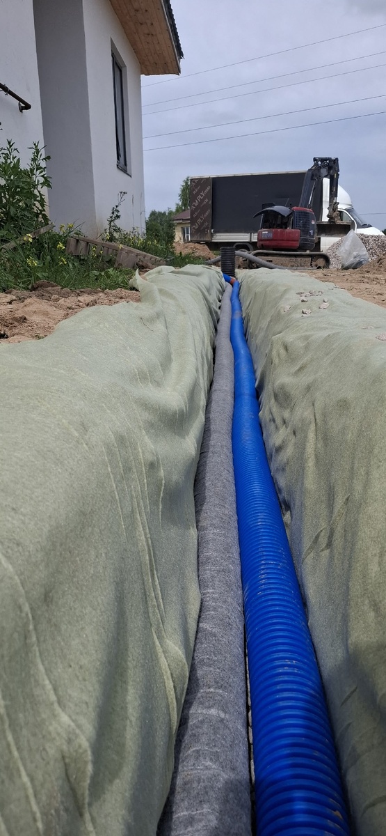 - Геотекстиль: Труба должна быть обернута в нетканый геотекстиль. Он пропускает воду, но задерживает частицы грунта.