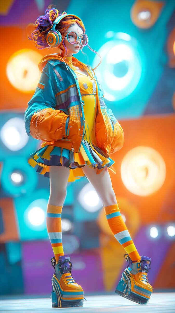 😊😊😊😊😊⬇️ Один промт 4 образа MidJourney⤵️ Создай персонажа, вдохновленного ярким и динамичным стилем, где используются насыщенные и сочные цвета. Она должна быть в стильной современной одежде, состоящей из ярких, чистых цветов: синие, оранжевые, желтые и фиолетовые оттенки. Модная комбинация — короткая юбка с крупными клетками, полосатые носки и массивные ботинки с высоким каблуком. Используй яркие акценты на аксессуарах, таких как большие очки и наушники, чтобы подчеркнуть современность образа. Персонаж позирует в динамичной позе, создавая ощущение движения. Освещение должно быть ярким, контрастным, с акцентами на лице и деталях одежды, чтобы подчеркнуть объем. Свет должен падать таким образом, чтобы выделять текстуры и формы, создавая красивые тени, особенно на складках юбки и текстуре носок. На фоне используй яркие и красочные элементы, такие как светящиеся лампочки и резкие линии, подчеркивающие движение. Эти элементы должны создавать визуальный интерес, но не отвлекать от п