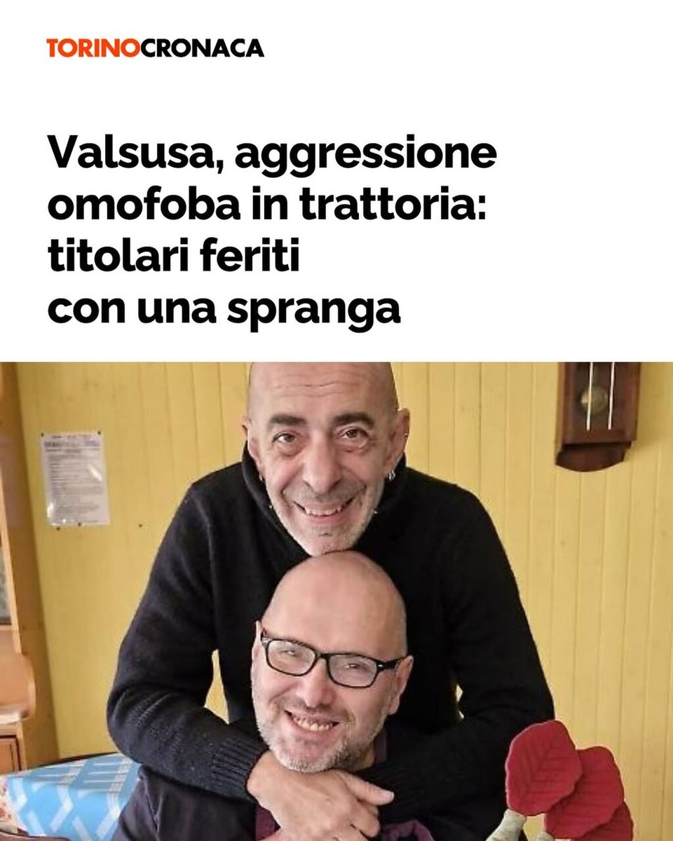 ✅ СПРАВКА: Эта новость переведена и размещена при помощи искусственного интеллекта Chat GPT без участия человека, в случае если вы заметили ошибку, или новость не соответствует реальному событию — сигнализируйте, исправим. 👉 Искренне Ваш Сержио Боттичелли: https://www.facebook.com/mercator.cz __________________ В среду, 18 февраля, в центре Сан-Антонино ди Суса произошел крайне серьезный эпизод насилия на гомофобной почве. В ресторане «Траттория деи Колори» владельцы Массимо и Франческо Джаакометти стали жертвами нападения группы людей во время обеда. «В 12:30 вошли три женщины и один мужчина, последний был вооружен железной битой, — рассказывает Массимо. — Они вырвали у меня телефон из рук и бросили его на прилавок, затем ударили меня головой и拳ом, сломав губу и зуб. На моего партнера надели руки на шею. Я ответил, ударив нападавшего ногой». Сразу после инцидента Массимо вызвал карбинеров, которые быстро прибыли и посоветовали ему обратиться в приемное отделение больницы в Сузе.