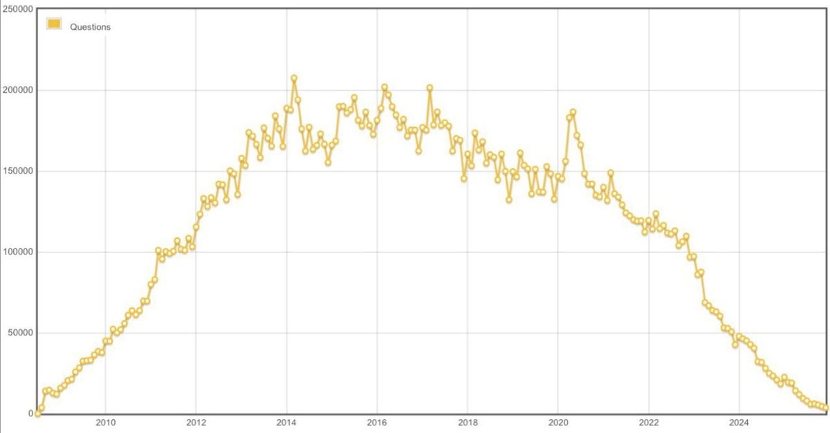 📝 Кратко: В декабре 2025 года на Stack Overflow задали 3 862 вопроса — на 78% меньше, чем годом ранее. 🔗 Читать оригинальную статью (ссылка) 📊 Источник: Habr ⏰ Время: 21.02.2026 17:48 📱 Другие каналы: 🪙 ВКрипту | 🎮 ВИгрухи | 🏎️ ВТачки | ✈️ ВТравелу #gadgets #гаджеты #технологии