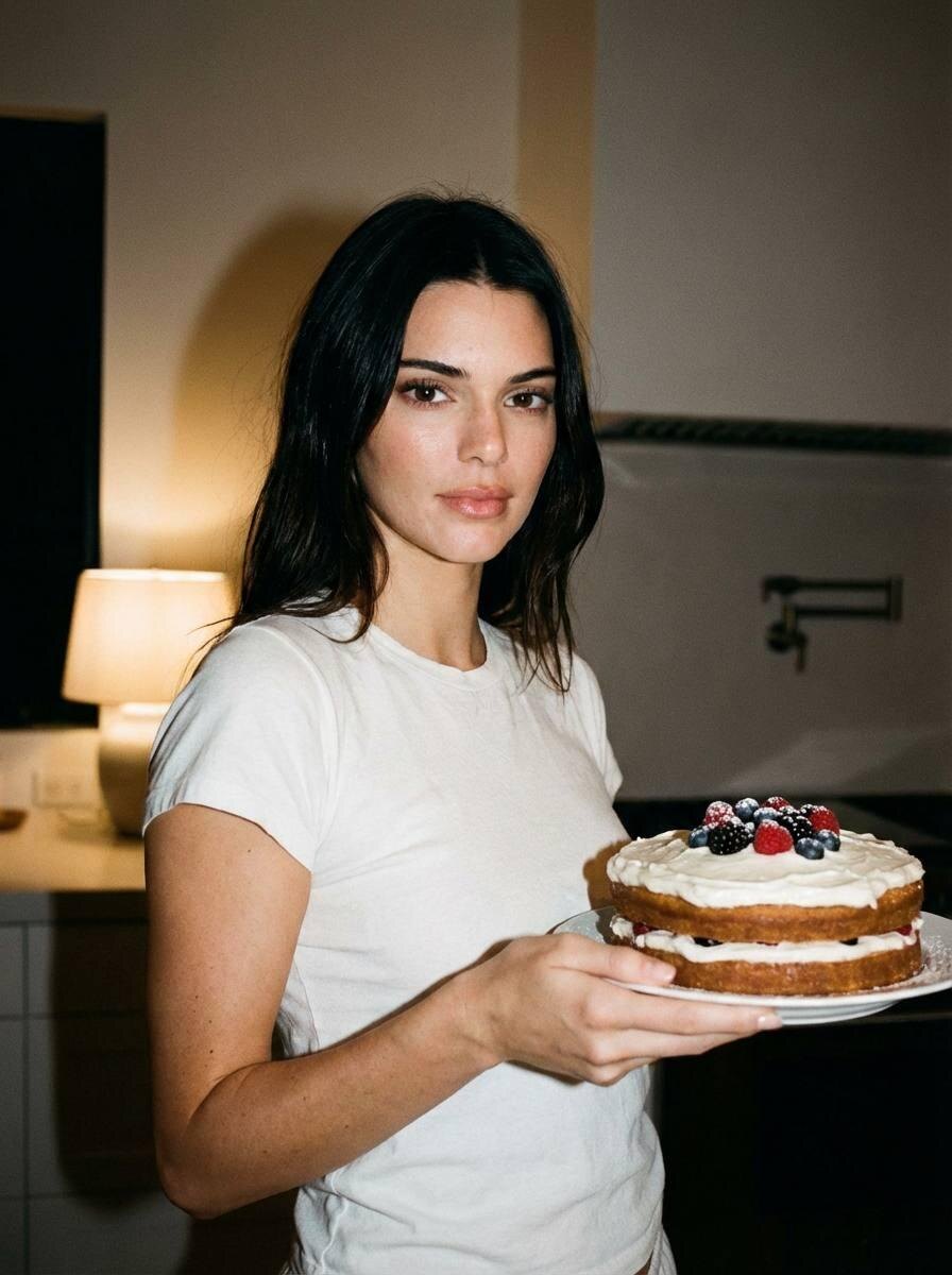Модель: Nano Banana Сгенерировать🪄 Фотография в стиле RAW с лёгкой зернистостью, тёплый домашний момент. Лицо девушки должно быть 1:1 как на референс-фото: сохранить 100% черты лица и индивидуальность (форма глаз, бровей, носа, губ, овал лица, тон кожи, возраст, мимика, любые уникальные особенности). Никаких изменений лица, никакой “похожести” — строго то же лицо, что на референсе. Девушка в домашней белой футболке держит торт. Фон — светлая кухня ночью, минималистичная и чистая, без лишних предметов. Атмосфера уюта и спокойствия, мягкий тёплый свет (как от лампы/ночного освещения), мягкие тени. Композиция простая, без других людей, фотореализм, естественная кожа, без сильной ретуши, лёгкий мягкий фокус. NEGATIVE PROMPT: изменение лица, другое лицо, “похожа но не она”, другая форма глаз/носа/губ/бровей, другая кожа, сильная ретушь, пластик, глянец, мультяшность, артефакты, размытое лицо, лишние люди, лишние руки/пальцы, деформации, текст, логотипы, водяные знаки, интерфейс соцсетей,