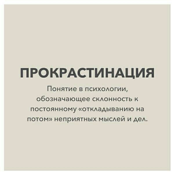 - Прокрастинация — активность, направленная на второстепенные задачи вместо приоритетных. Сопровождается внутренним напряжением, тревогой и чувством вины.