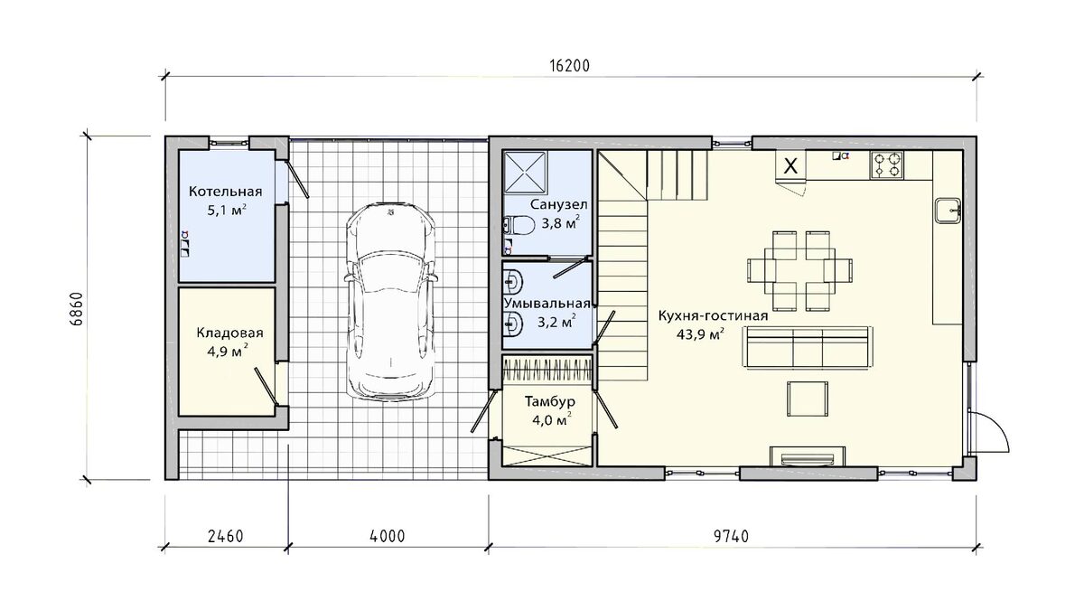 Проект ПБ-154 — современный двухэтажный дом размером 7x16 метров с 3 спальнями, общей площадью 157,3 м², с въездной аркой для парковки автом