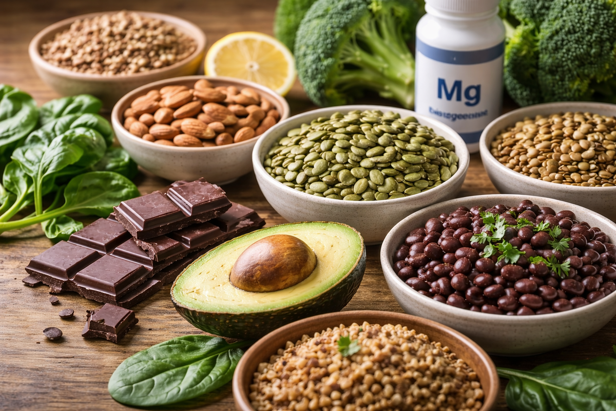Лучшие пищевые источники магния — это тёмный шоколад от 70% какао (и это делает шоколад реально полезным продуктом в разумных количествах), тыквенные семечки, которые содержат один из самых высоких показателей магния на 100 г среди любых продуктов, миндаль и кешью, шпинат и другая тёмная листовая зелень, авокадо, чёрные бобы и чечевица, цельнозерновые крупы — особенно гречка и овёс.