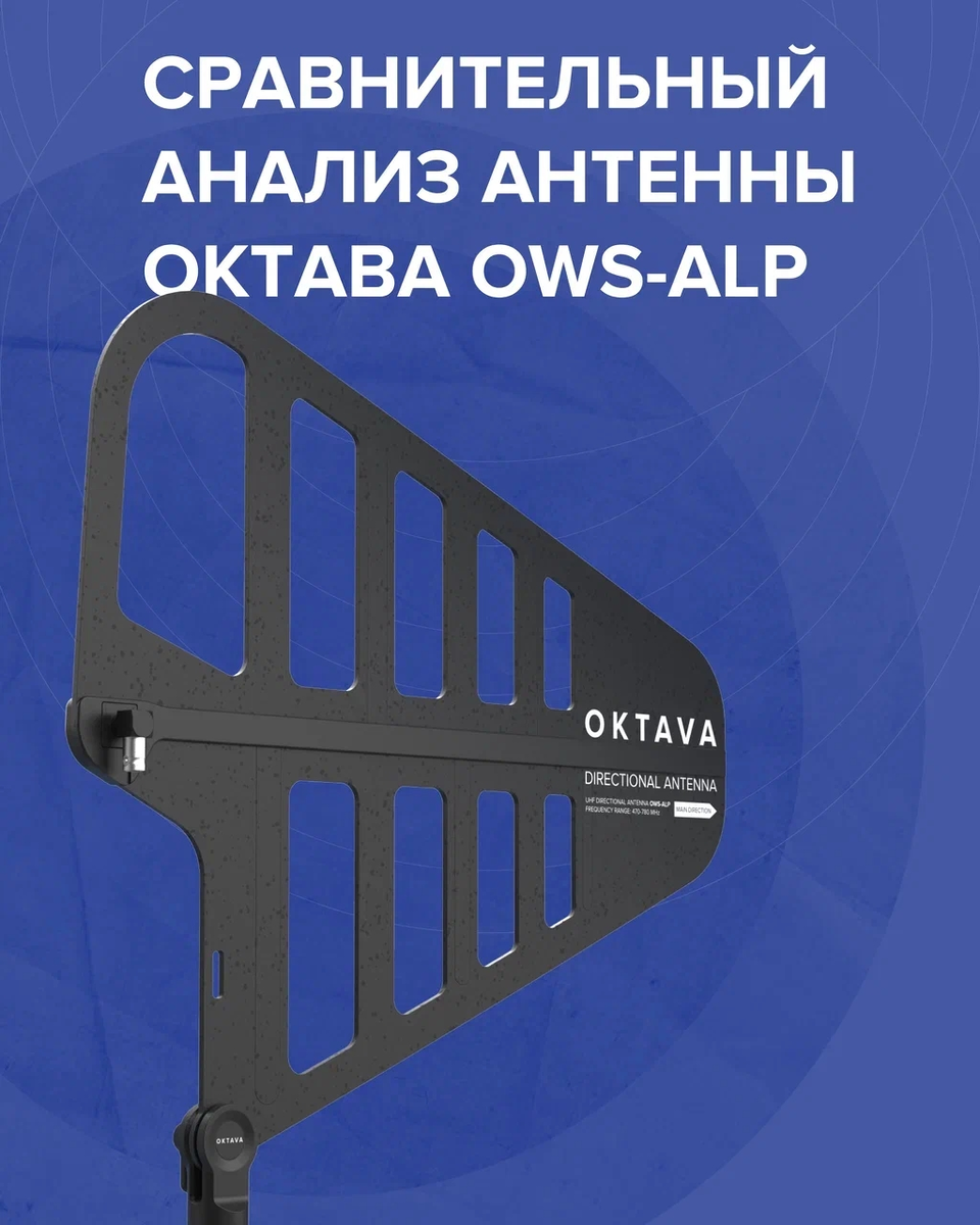 Целью нашего исследования стал сравнительный анализ Октава OWS-ALP с конкурирующими моделями антенн. Мы провели измерение коэффициента стоячей волны (КСВ) пассивных антенн в рабочем диапазоне частот 470-780 МГц. КСВ является важнейшим параметром согласования антенны с фидерным трактом и напрямую влияет на эффективность передачи и приёма радиосигнала. Измерения проводились с использованием векторного анализатора цепей SYSJOINT SV4401A в режиме измерения параметра S11. Результаты измерений антенны Октава OWS-ALP: Среднее КСВ в диапазоне 470 -780 МГц = (1,161+1,693+1,154+1,408+1,233)/5 = 1,33 Результаты измерений антенны SHURE PA805SWB: Среднее КСВ в диапазоне 470 -780 МГц = (1,457+1,474+1,459+1,222+1,769)/5 = 1,5 Результаты измерений антенны SHURE PA805SWB: Среднее КСВ в диапазоне 470 -780 МГц = (1, 594+1, 764+1, 516+1, 282+1, 869)/5 = 1,6 Результаты измерений антенны Sennheiser A2003: Среднее КСВ в диапазоне 470 -780 МГц = (1, 4+1, 194+1, 242+1, 765+1, 913)/5 = 1,5 Антенна Октава OWS-AL